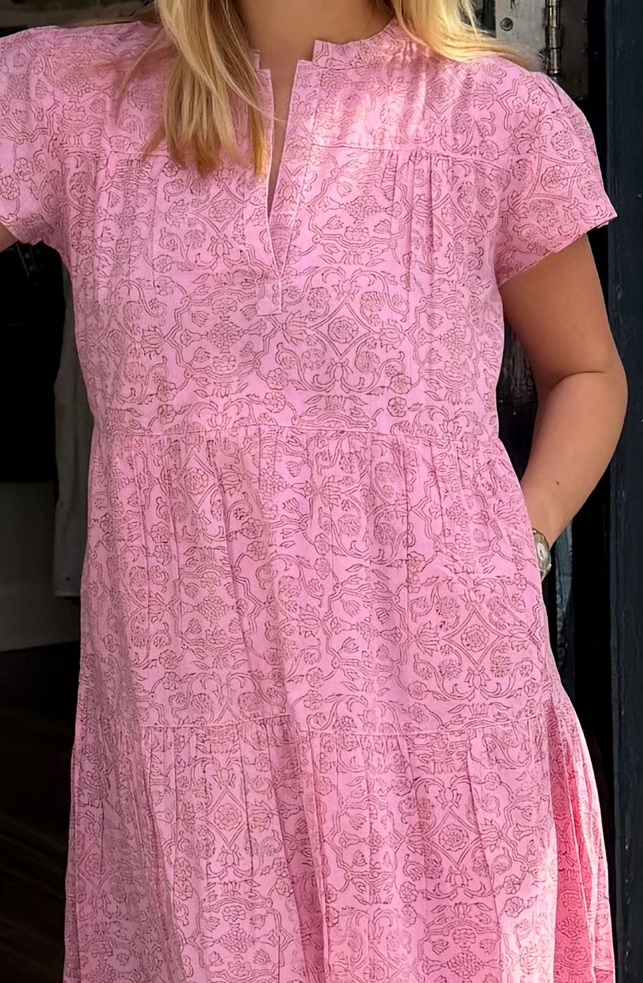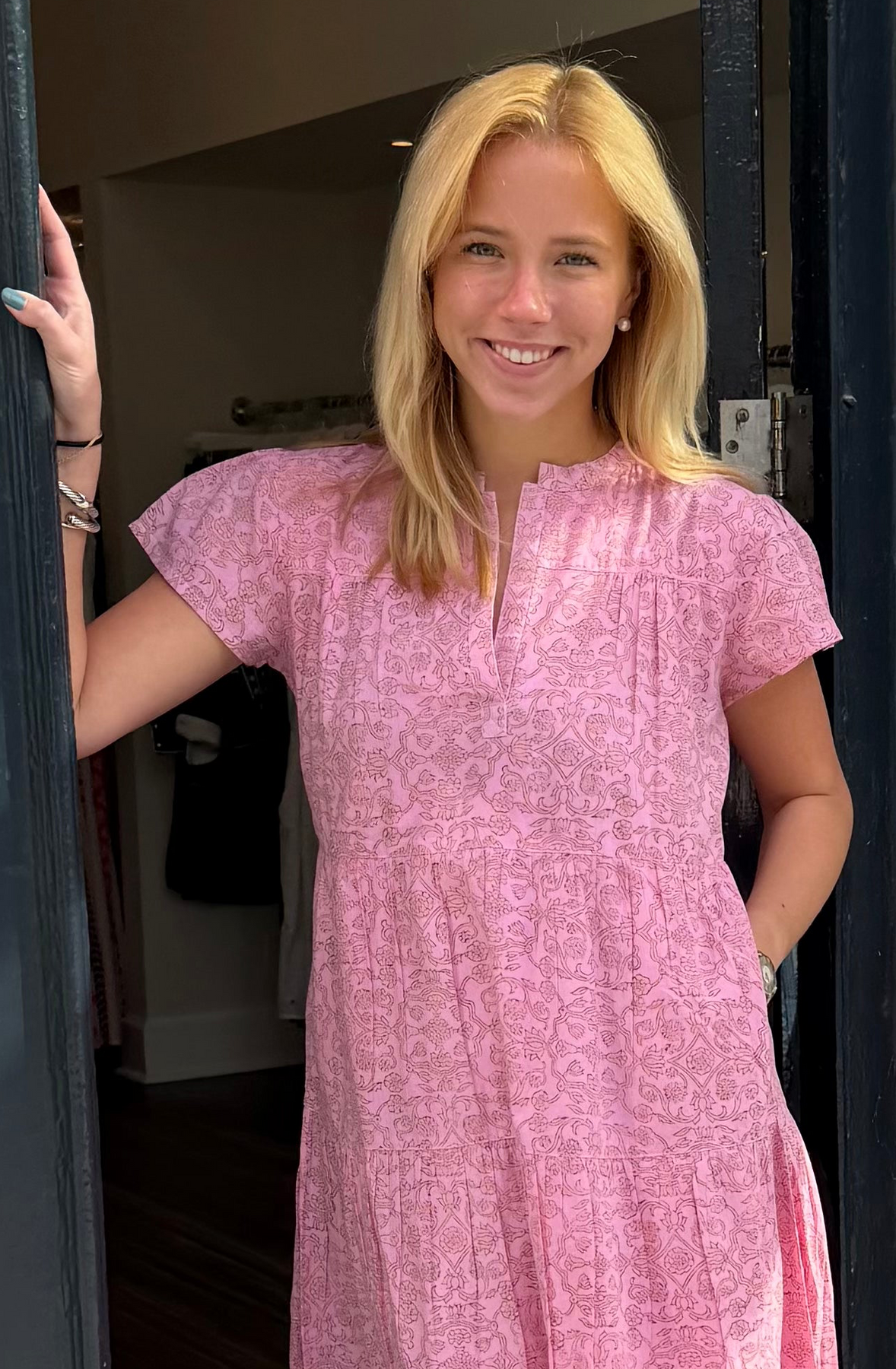 The Folly Dress - Meet the Folly, named after one of our local beaches, Folly Beach. Relaxed style at its best! A midi length tiered dress. A mandarin collar V-neck with short sleeves. Feminine and flirty. Our best seller.