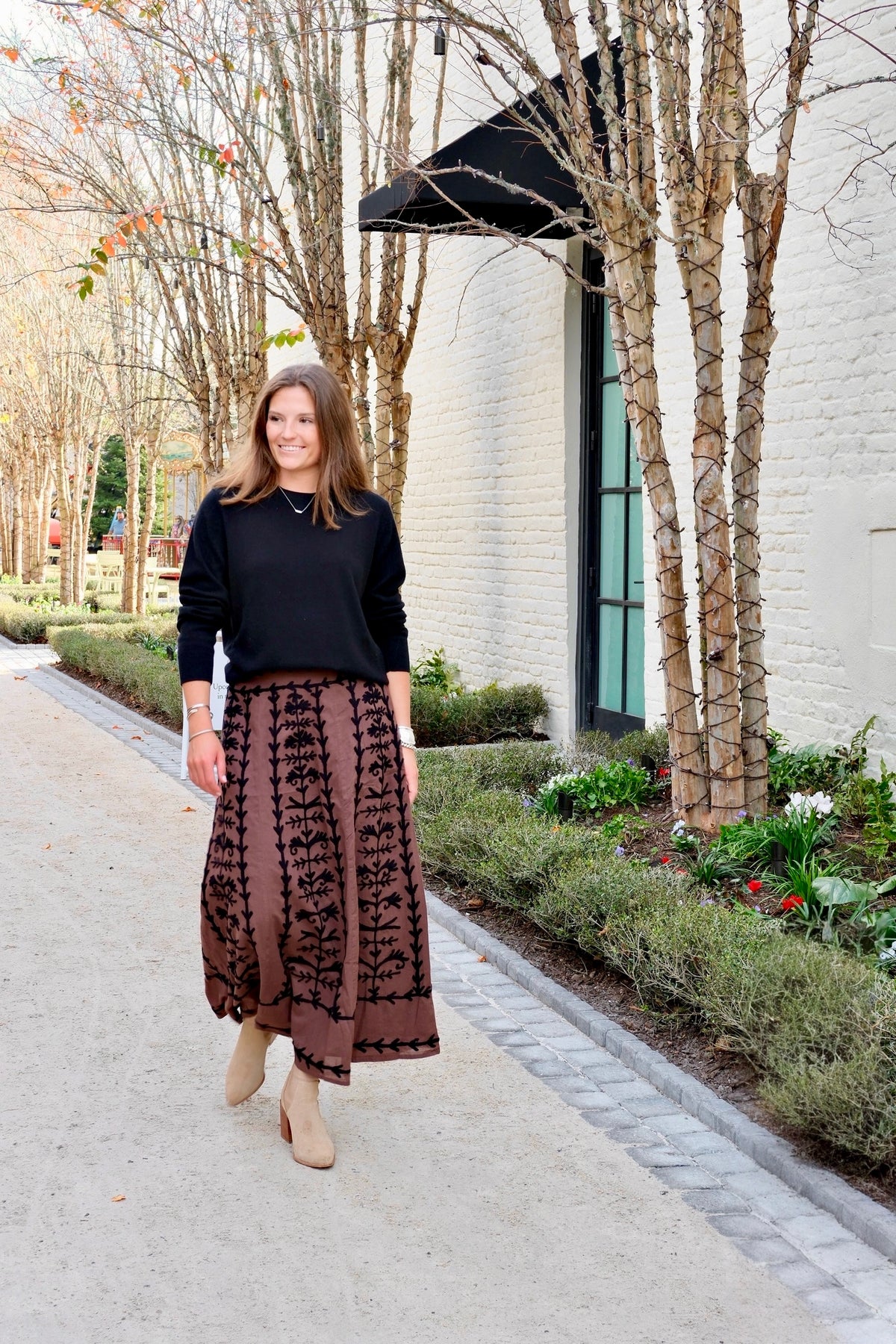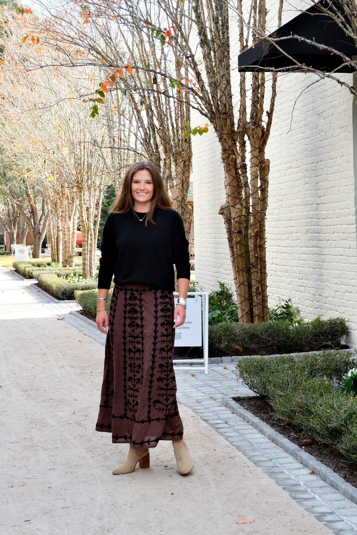 Hanley Midi Skirt Vine - Brown with Black Embroidery