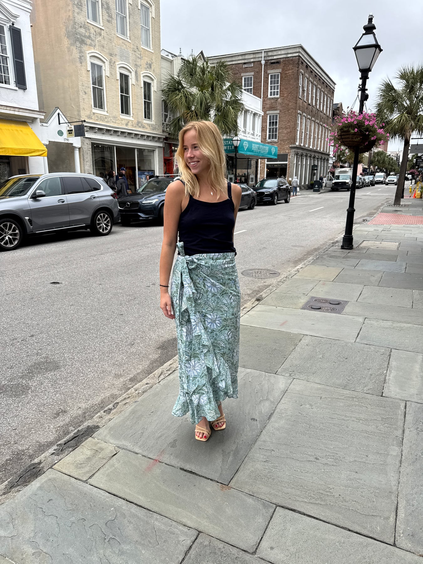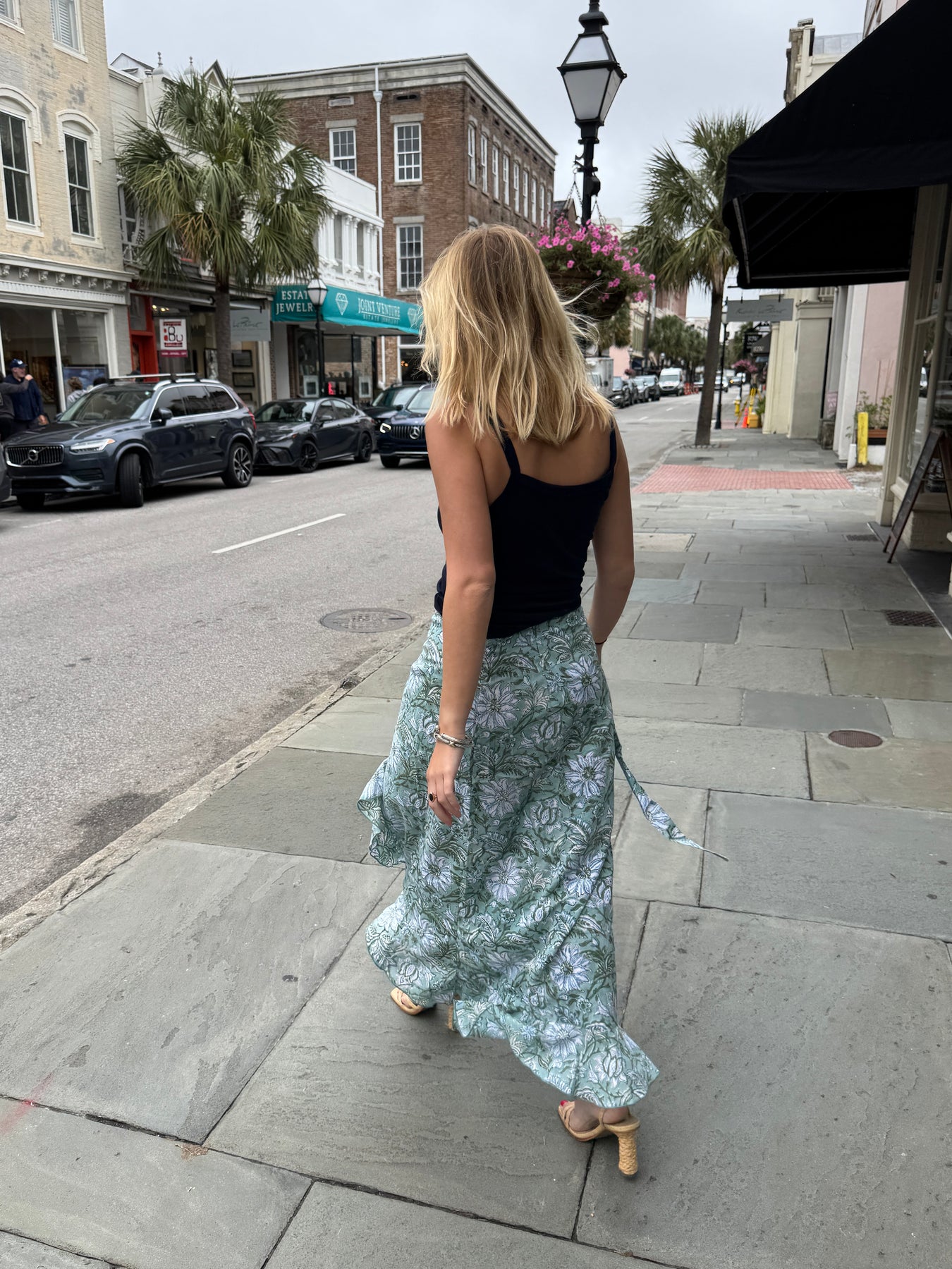 Step into effortless elegance with our Wrap Midi Skirt featuring cascading ruffles. This charming skirt combines comfort with style, thanks to an adjustable tie waste.