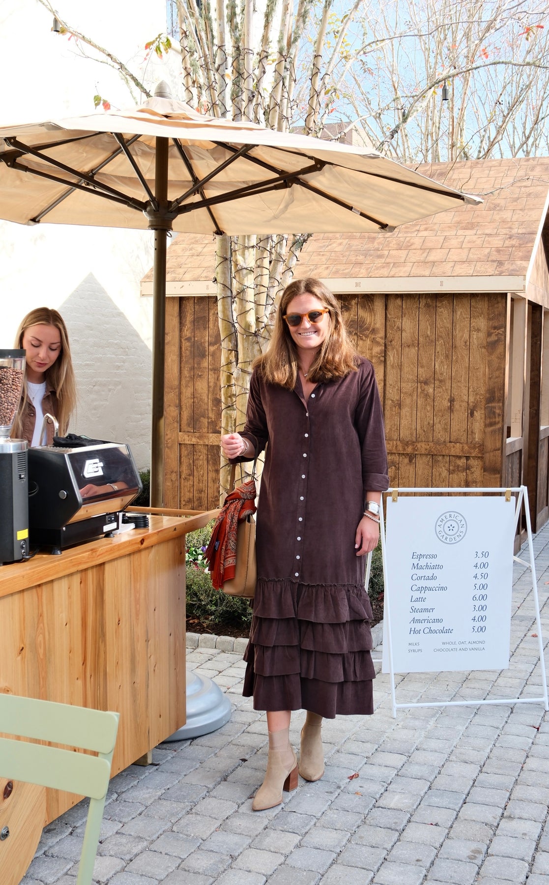 The Lola - Make an entrance with this chic hostess dress, a cover up, or anything you want it to be! Buttons down the front with a collar. Tiered layers on the bottom for some added flare! Fabulous with espadrilles or flats.