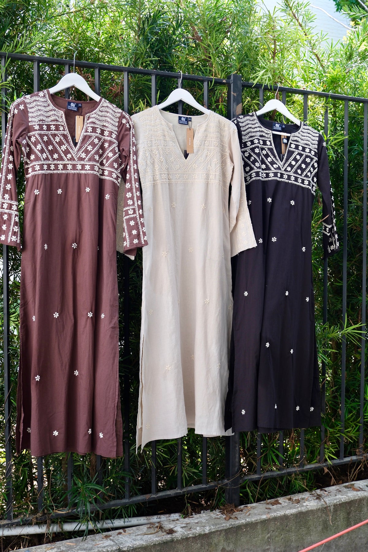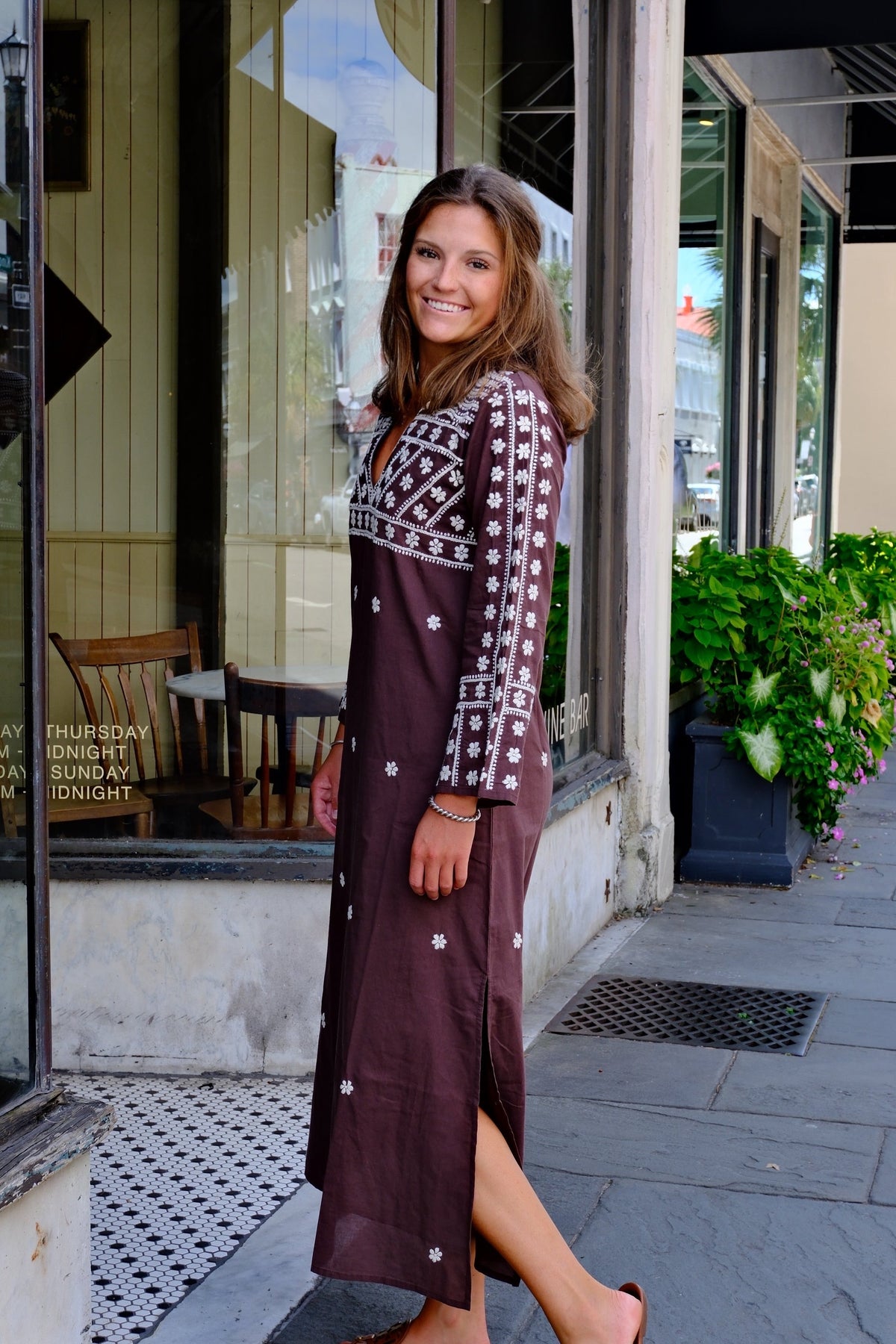 Molly Maxi Dress Hand Embroidered Brown/Cream