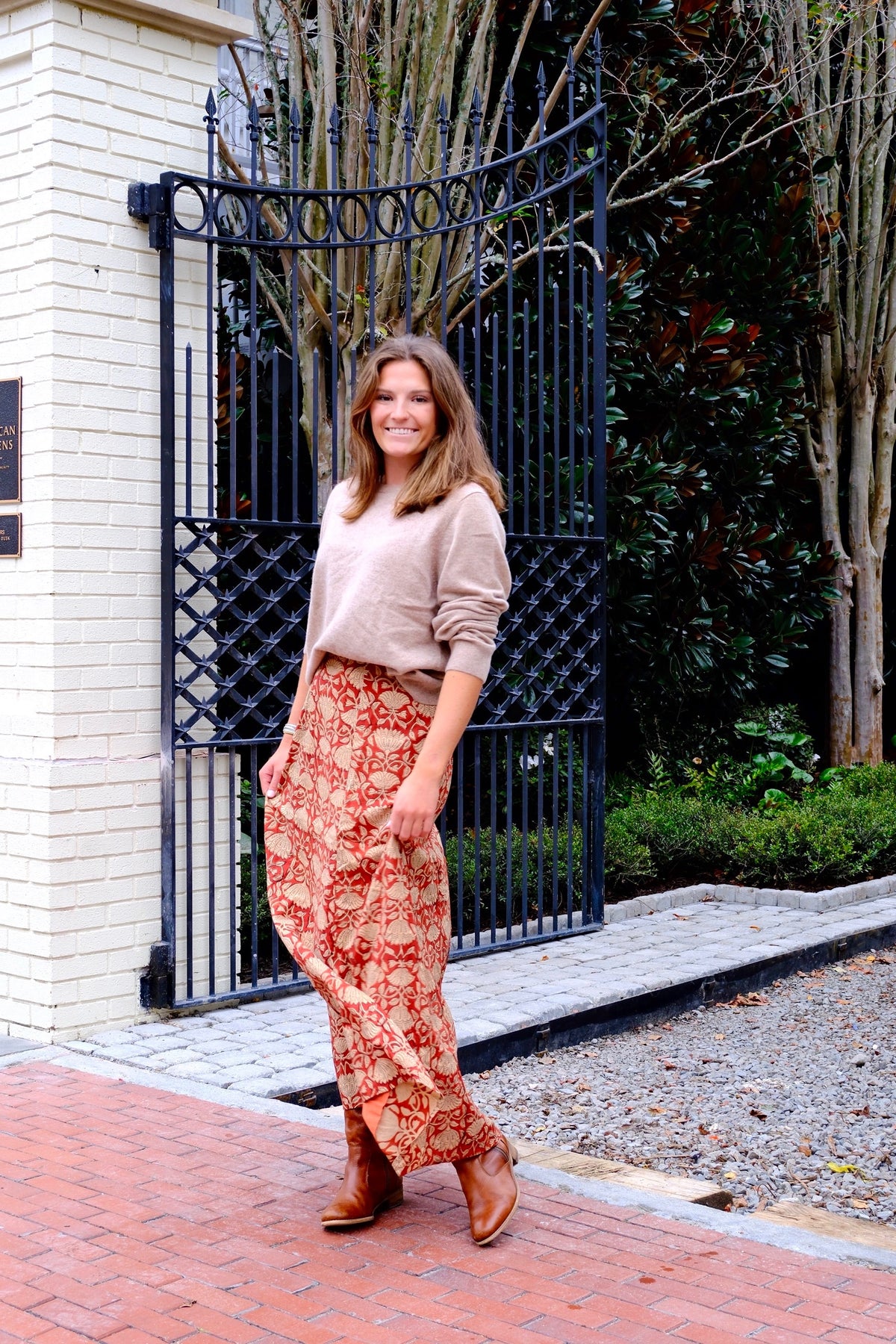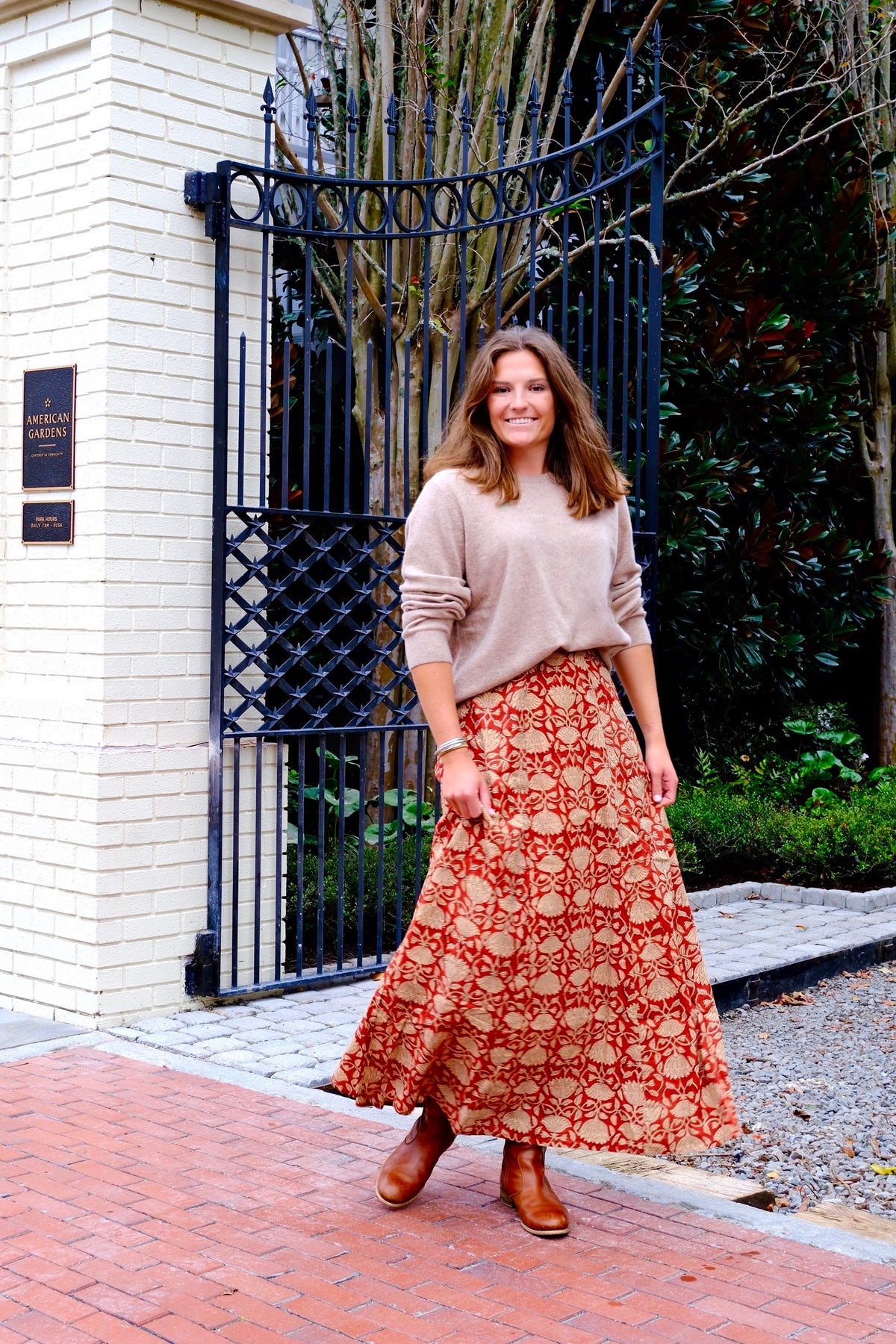 The most flattering skirt you'll ever own. Very slimming. Inconspicuous elastic in the back with a side zipper. Wear with sandals in the summer and boots in the fall and winter.